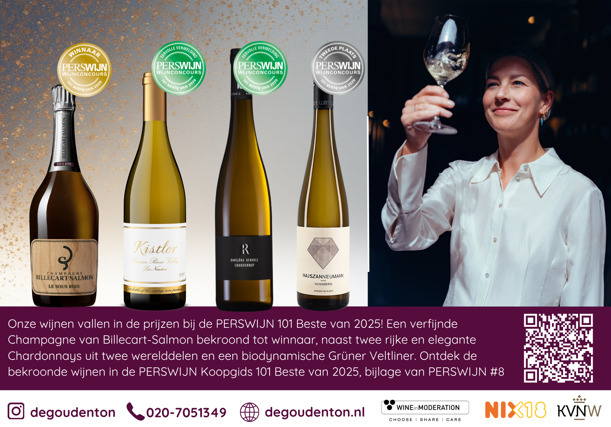 Onze wijnen vallen in de prijzen bij de PERSWIJN 101 Beste van 2025! Een verfijnde Champagne van Billecart-Salmon bekroond tot winnaar, naast twee rijke en elegante Chardonnays uit twee werelddelen en een biodynamische Grüner Veltliner. Ontdek de bekroonde wijnen in de PERSWIJN Koopgids 101 Beste van 2025, bijlage van PERSWIJN #8